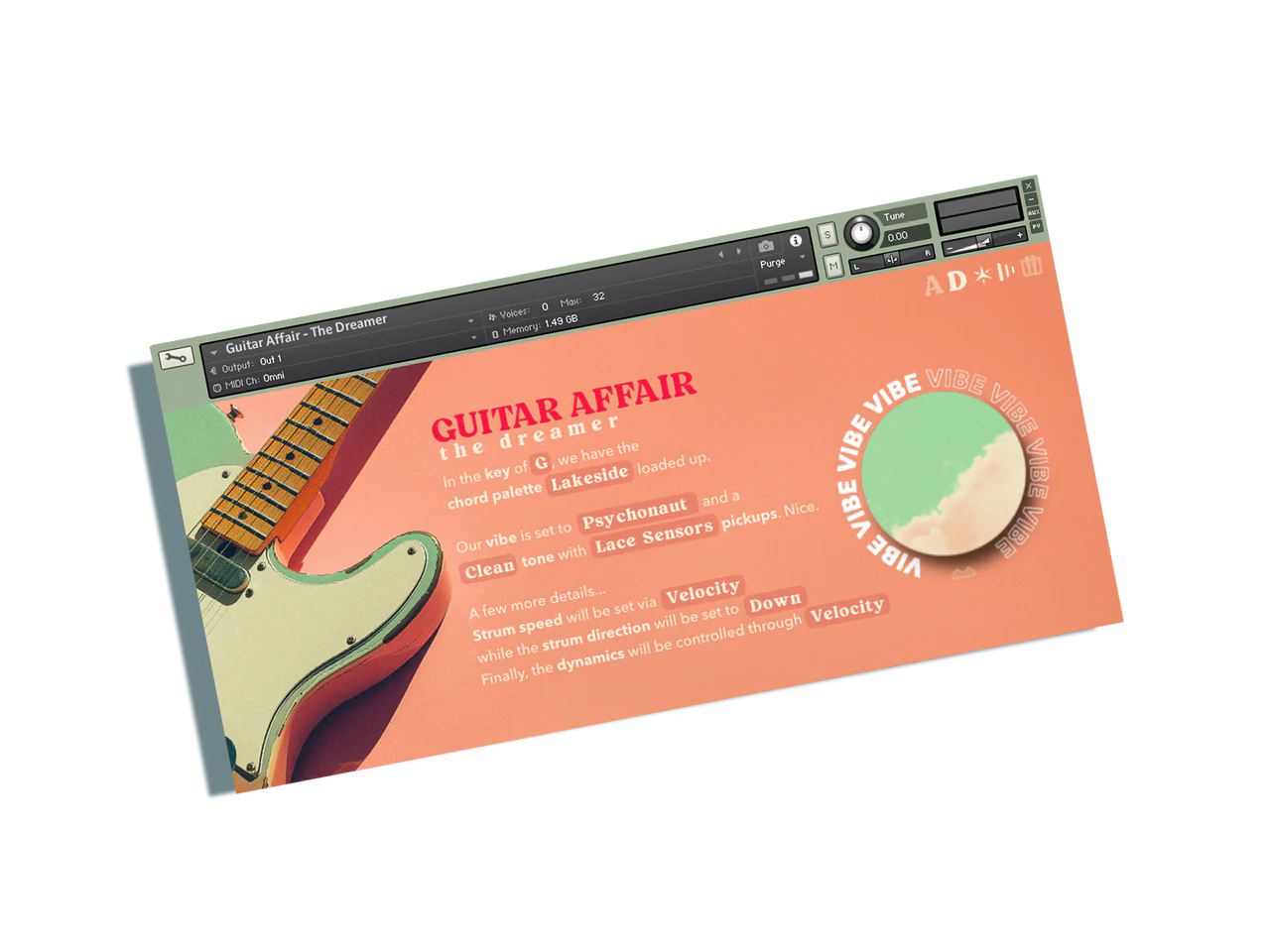 Guitar Affair: The Dreamer is the daydream with strings you did not know you needed. You get 12 lush chord palettes with real voice leading so progressions melt together like an actual guitarist played them. On top of that, there are 10 dreamy presets ready to drop into your track.